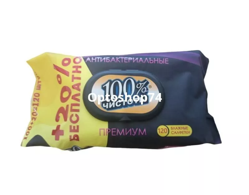 Влажные салфетки антибактерияльные "100% Чистоты" PREMIUM 120 штук в пачке.