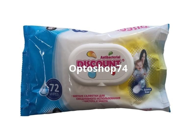 Влажные салфетки Discount антибактериальные для детей 72 штуки в упаковкес клапаном, коробка 20 штук. Влажные салфетки купить оптом.
