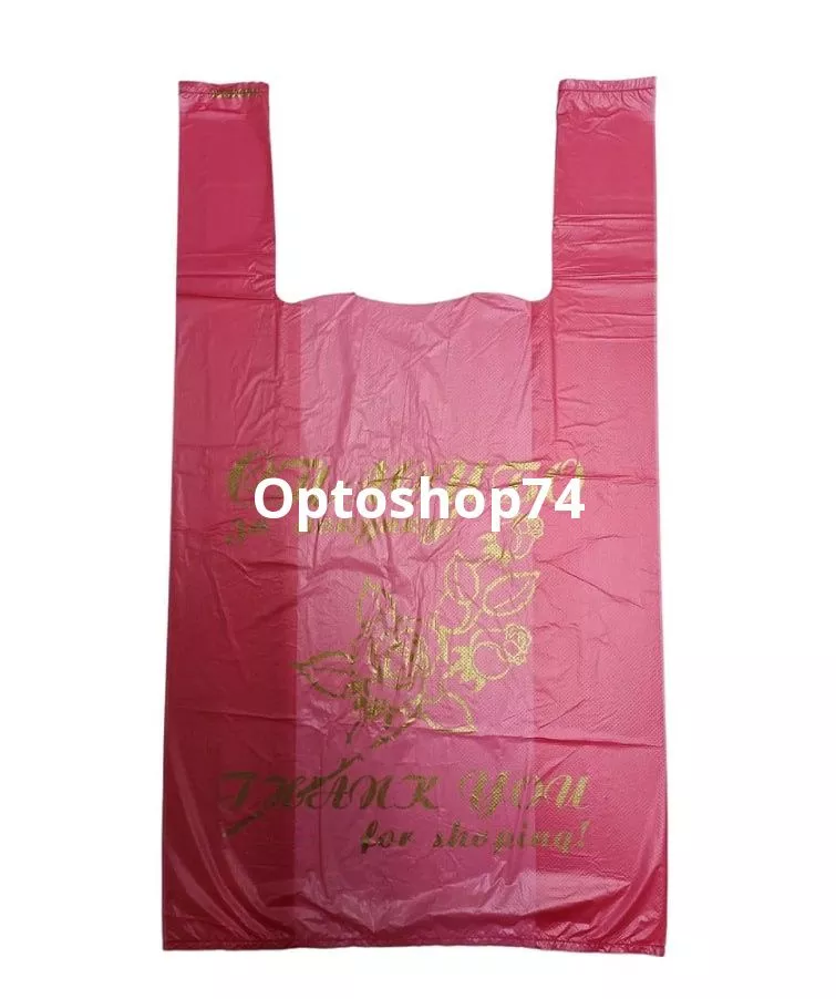Купить пакет майка красная "Спасибо за покупку", в упаковке 100 штук, мешок 25 упаковок.