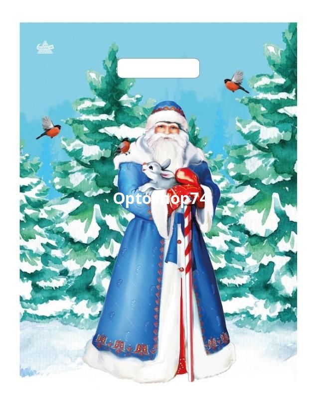Купить пакет с вырубной ручкой "Новогодний гость" 31*40 60 мк, производства Тикопластик, упаковка 50 штук.